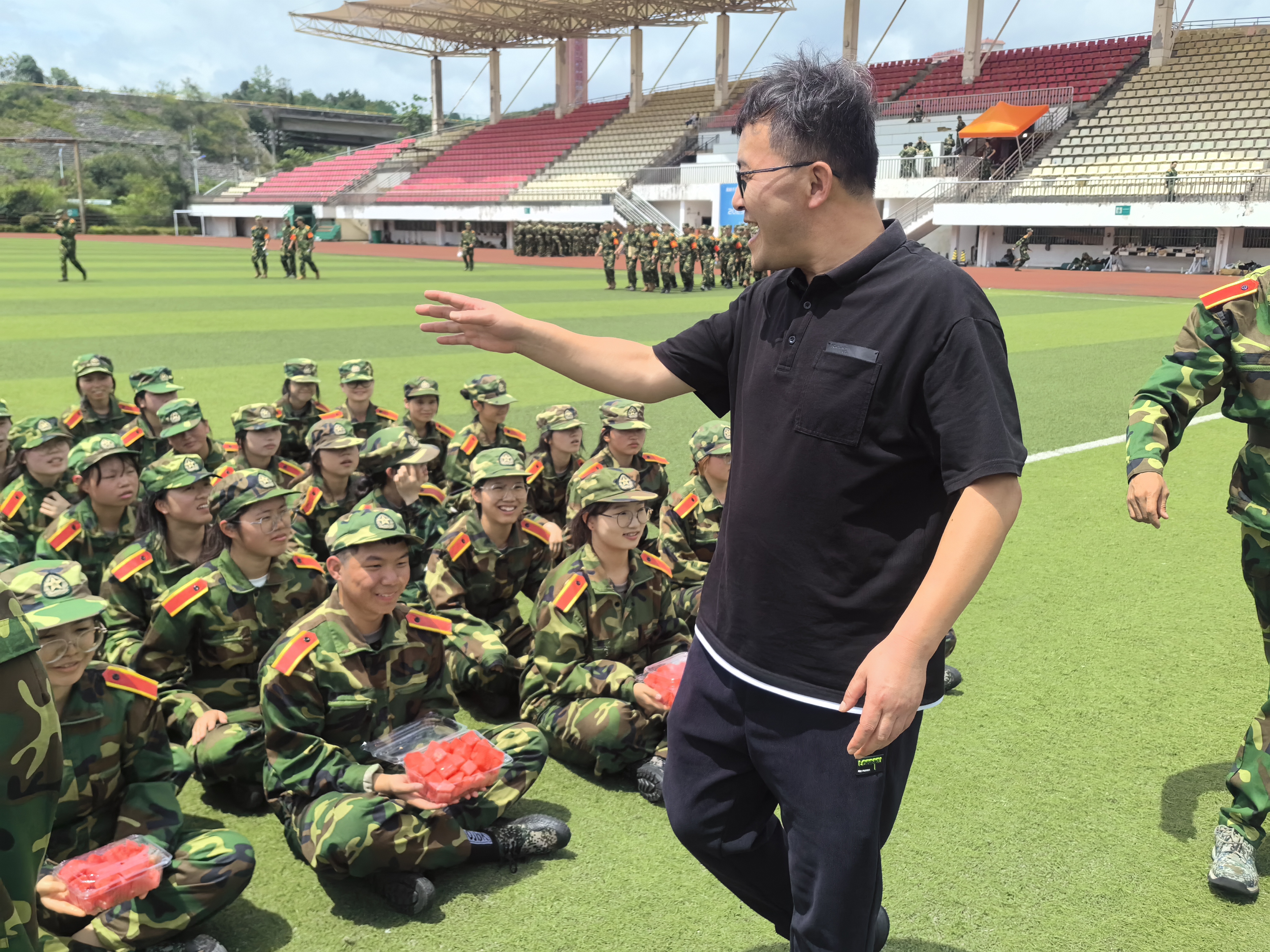 大家到达现场时,学生们正顶着烈日,以饱满的精神状态进行军训。为了缓解同学们在炎热天气下的疲惫,谭健副书记和辅导员们将冰凉的西瓜送到学生手中。这份突如其来的清凉,让同学们感受到了学院老师的深切关怀,也让他们更加坚定了战胜困难的信心。