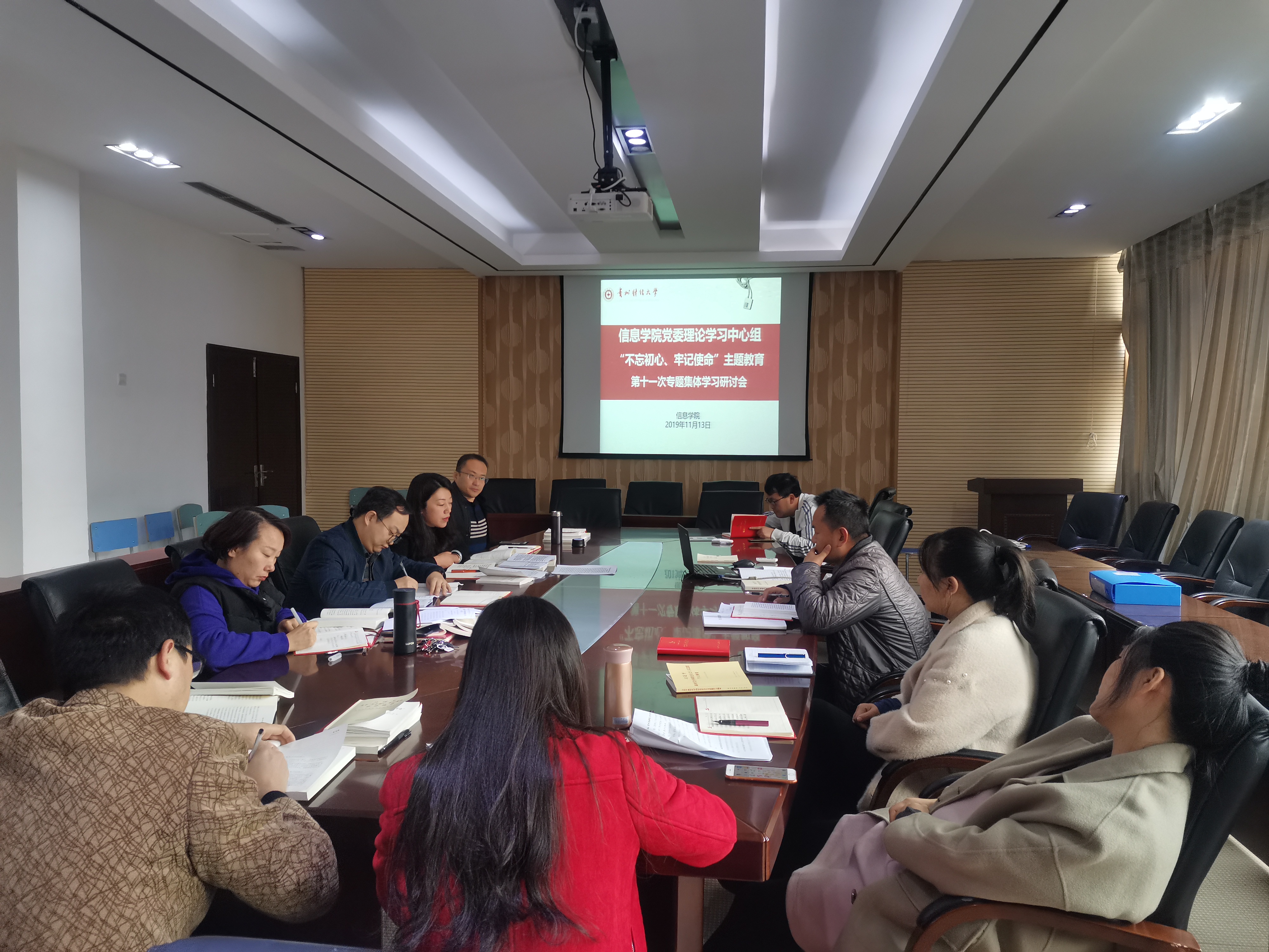 党委理论学习中心组“不忘初心、牢记使命”主题教育第十一次专题集体学习研讨会,学院领导、各系(科室)负责人、党支部书记参会,卿春主持会议。