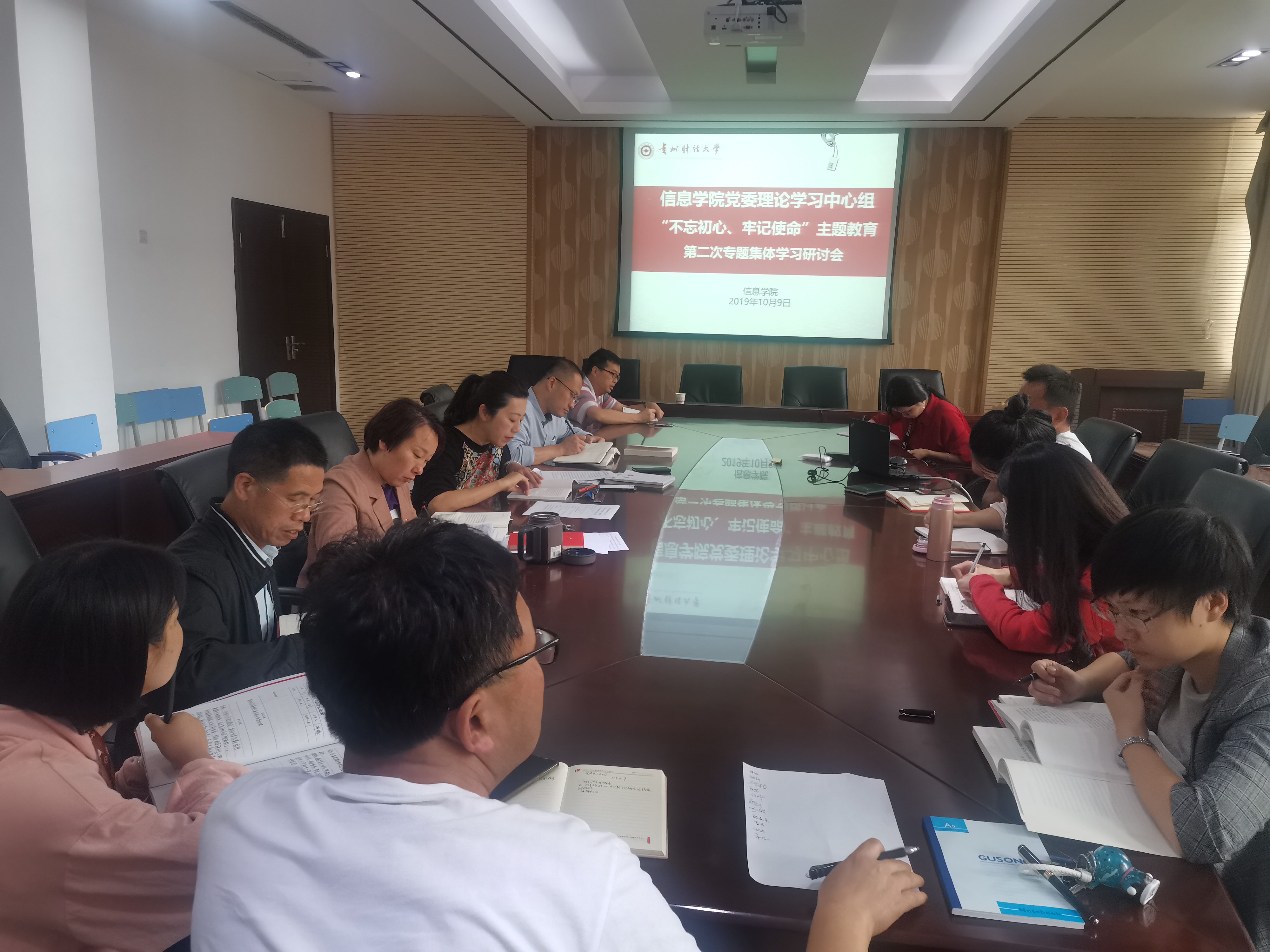 党委理论学习中心组于10月9日上午10点在志学楼427会议室召开“不忘初心、牢记使命”主题教育第二次专题集体学习研讨会,学院领导、科室负责人、党支部书记参会,卿春主持会议。