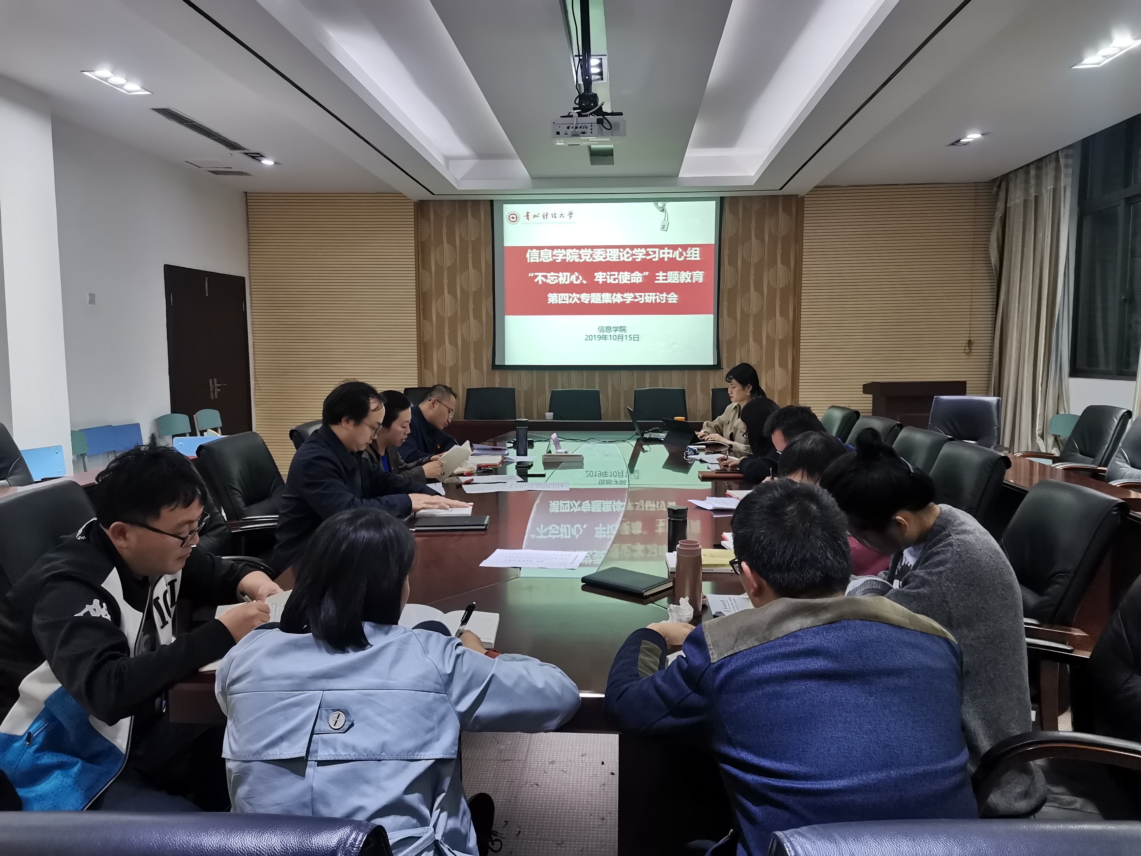 党委理论学习中心组于10月15日下午6点在志学楼427会议室召开“不忘初心、牢记使命”主题教育第四次专题集体学习研讨会,学院领导、各党支部书记、各科室、系负责人,卿春主持会议。