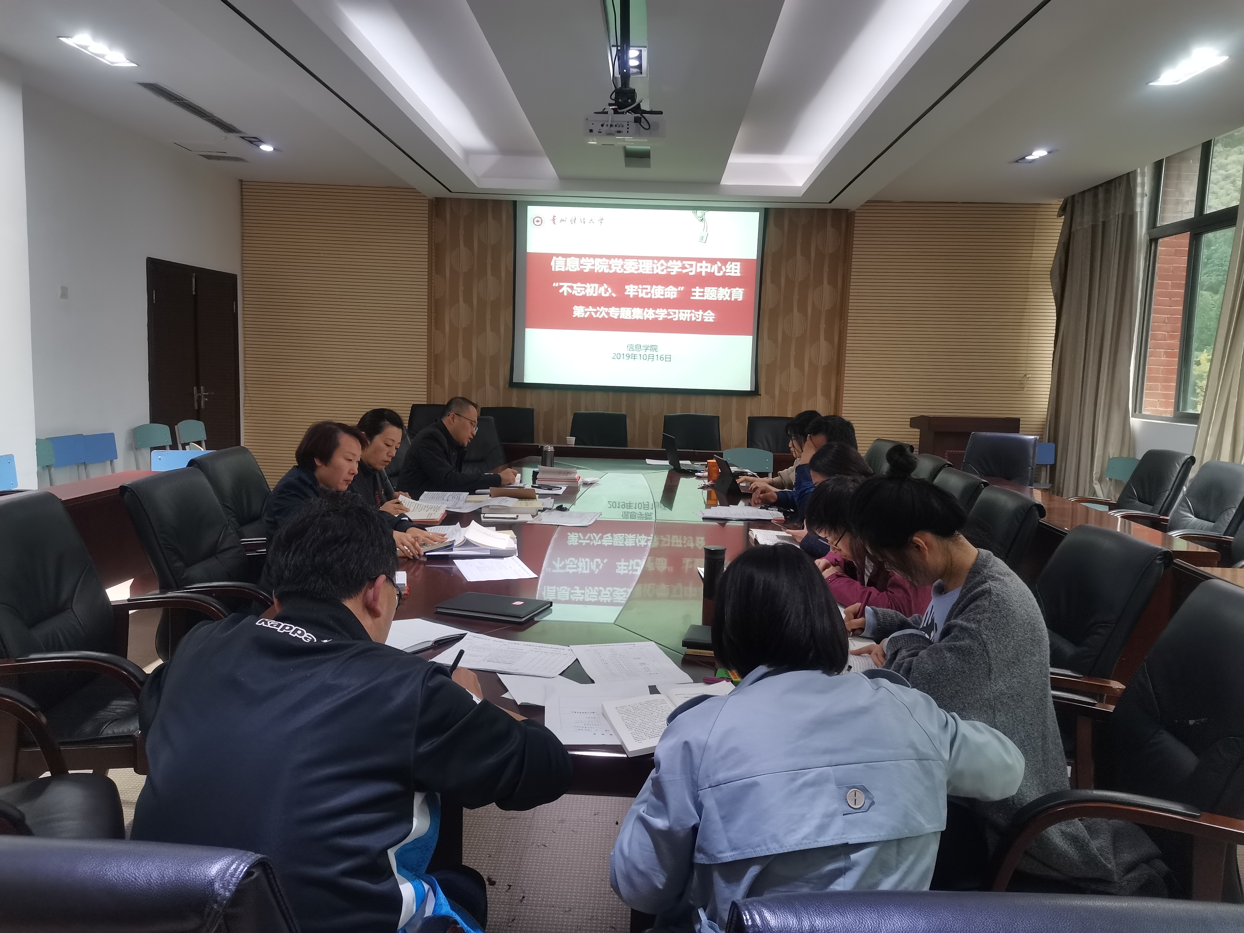 党委理论学习中心组于10月16日下午4点半在志学楼427会议室理论学习中心组召开“不忘初心、牢记使命”主题教育第六次专题集体学习研讨会,学院领导、各系(科室)负责人、党支部书记参会,卿春主持会议。