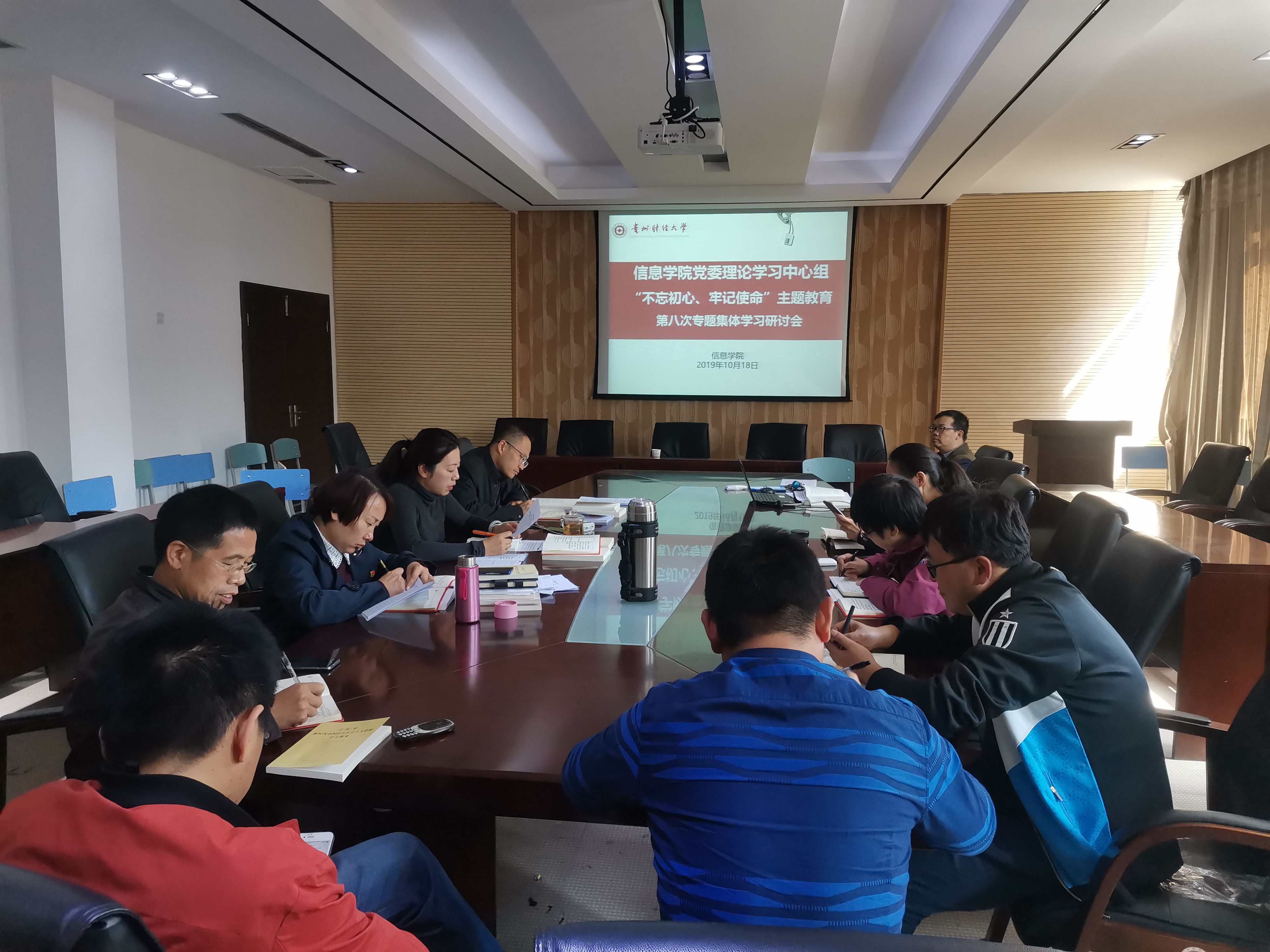 党委理论学习中心组于10月18日下午一点在志学楼427会议室理论学习中心组召开“不忘初心、牢记使命”主题教育第八次专题集体学习研讨会,学院领导、各系(科室)负责人、党支部书记参会,卿春主持会议。