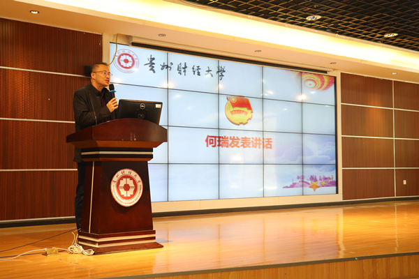 何瑞发表讲话。他指出,在高校教育改革实践中,大学生课外学术科技作品竞赛活动对培养大学生的科学精神和创新能力起着重要作用,希望借此大赛同学们能够把理论学习转化为实干苦干的热情,在学院营造爱学习、求真知、务实干的学术氛围,同时希望同学们开拓视野、培养兴趣,积极参与学术科技节的相关活动。