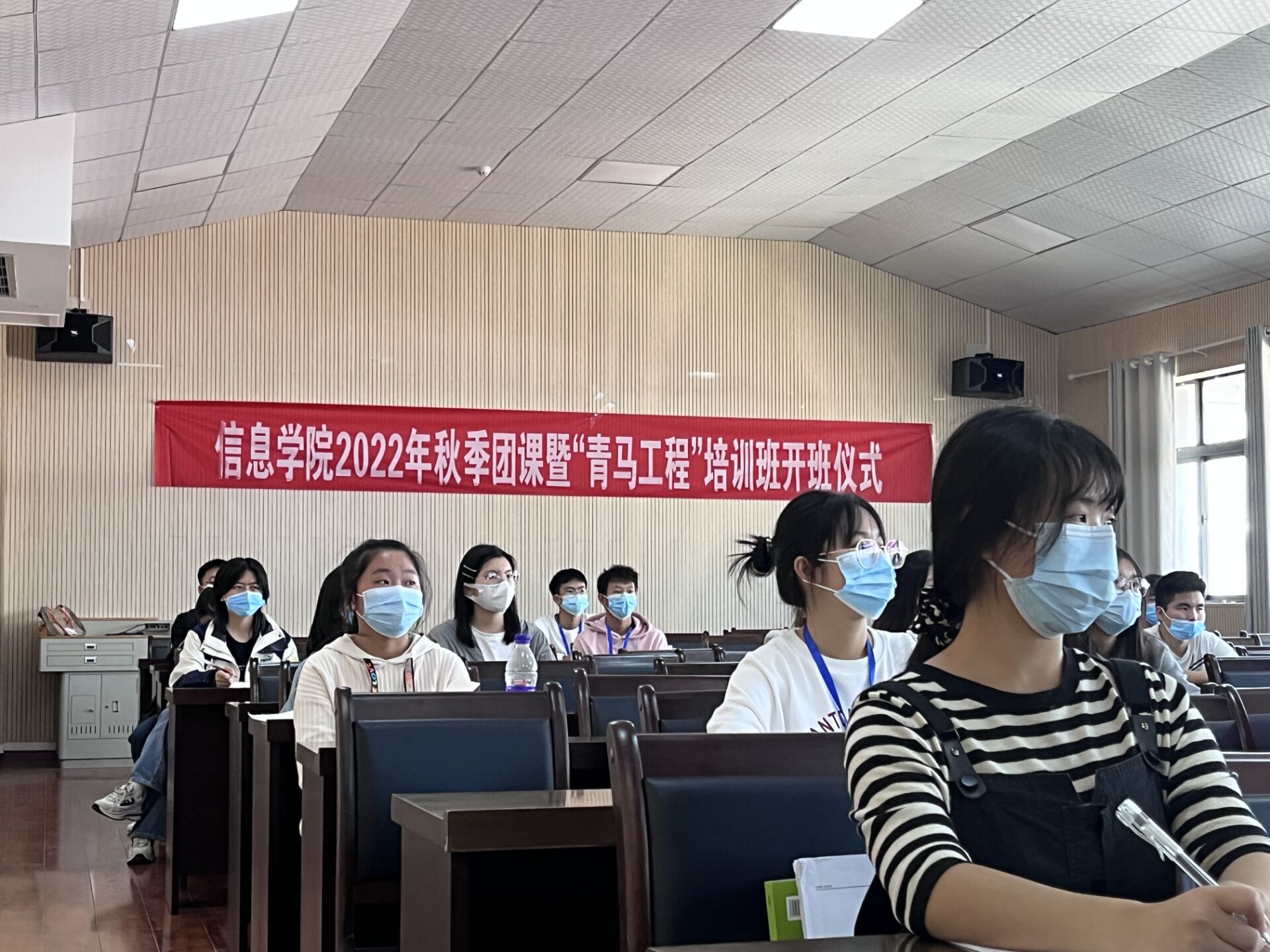 2022年秋季团课暨“青马工程”培训班开班典礼在志学楼506报告厅举行,学院正处级专职组织员徐聚星、团委副书记李杰、培训班140余名学员参加。