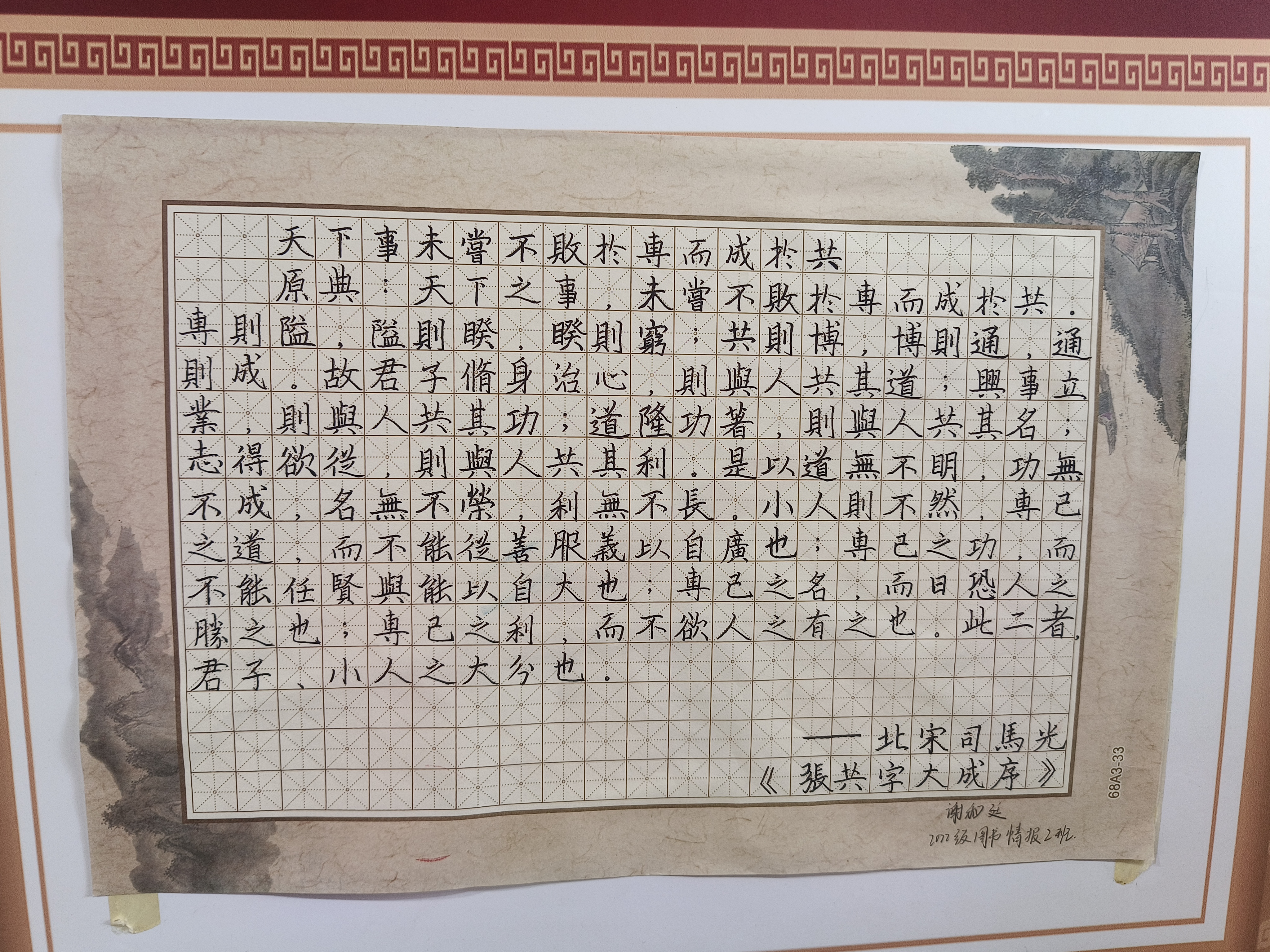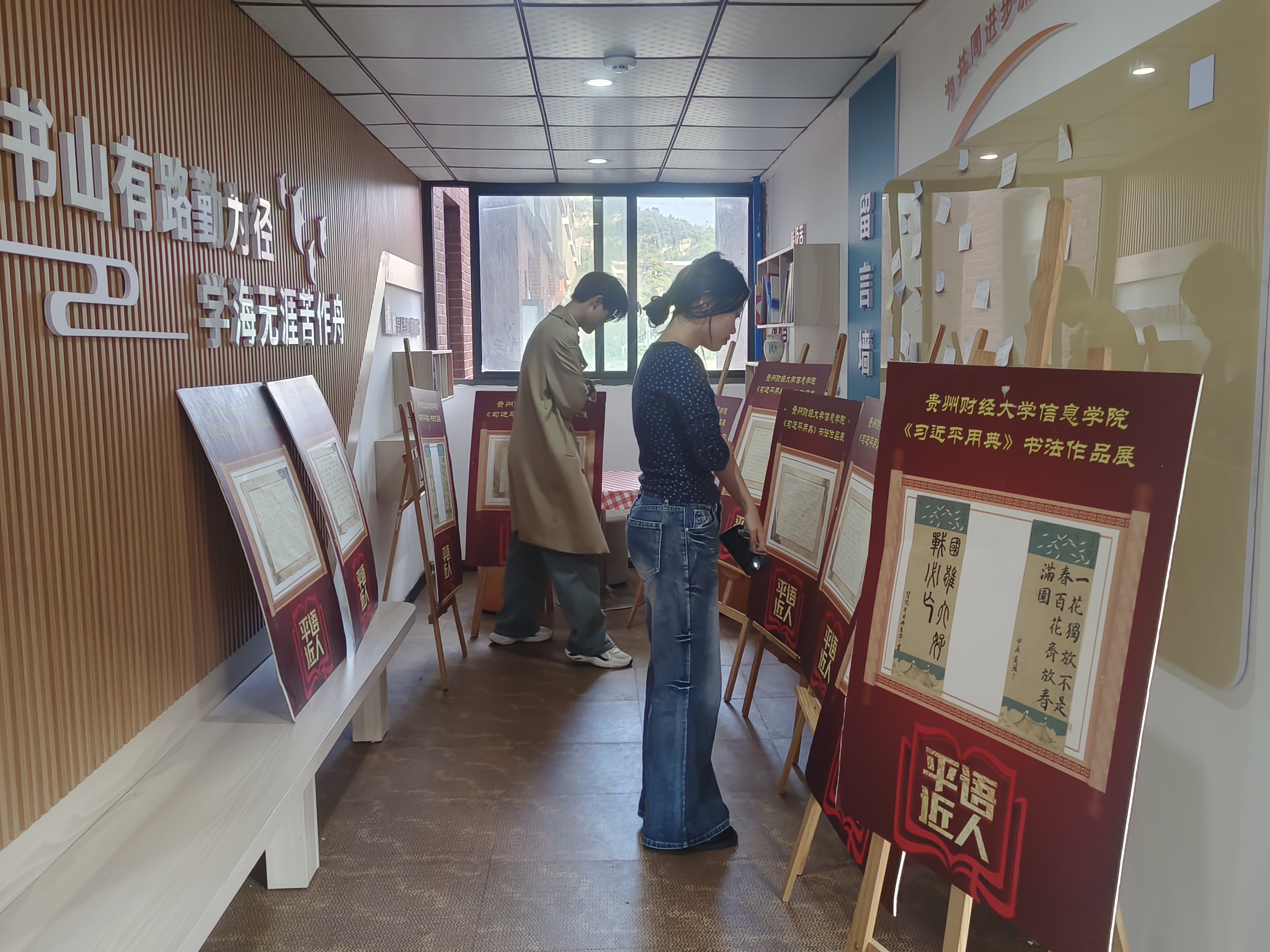 组织开展了《习近平用典》书法研习比赛,并于2024年11月17日-24日在樱花苑1栋一站式学生社区进行了优秀作品展示,吸引了很多爱好书法的师生驻足观看。