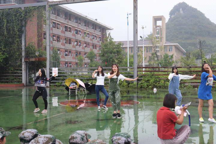 在何瑞副书记与教官交接之后,团委学生会成员在取得教官的同意后,有序地同新生一起前往田径运动场。慰问初期,何瑞副书记与王游滨老师对新生进行慰问,并鼓励大家辛勤军训;看着新生们即使在细雨连绵中,仍然坚持训练,毫不畏惧,何家旭老师不禁触景生情,鼓励新生再创佳绩,再创辉煌,勇夺第一,在接下来军训这几天努力坚持,在以后的学习中刻苦努力;在给新生以及教官发放慰问品的同时,团委学生会的学姐们也带来了精彩的舞蹈,但由于恶劣的天气,表演进行到一半就终止了,学姐表示非常的抱歉、遗憾。学院领导、团委学生会与新生们合照后,本次活动圆满结束。