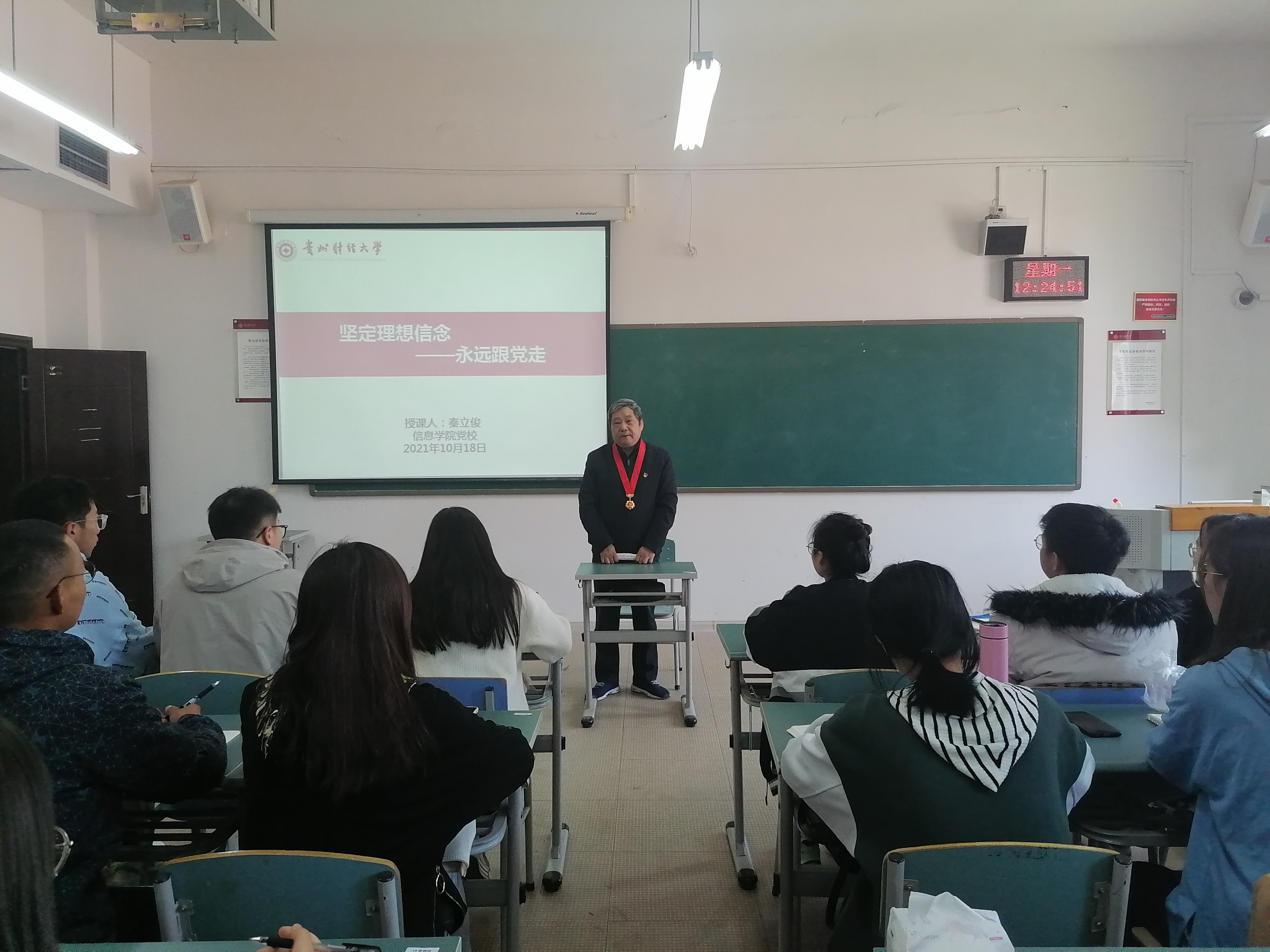课上,关于“为什么要入党”,党建组织员秦立俊结合自身的入党经历告诉入党积极分子,不能简单阐述自己的入党动机,而是要在思想上和行动上积极向党组织靠拢。此外,党建组织员秦立俊向入党积极分子展现自己作为一名优秀老党员的荣誉勋章,激励入党积极分子成为一名优秀党员的决心,秦立俊表示他和入党积极分子们有共同的理想:“不忘初心,牢记使命,为中国共产党奋斗终身,为中华人民谋幸福,为中华民族谋复兴”。