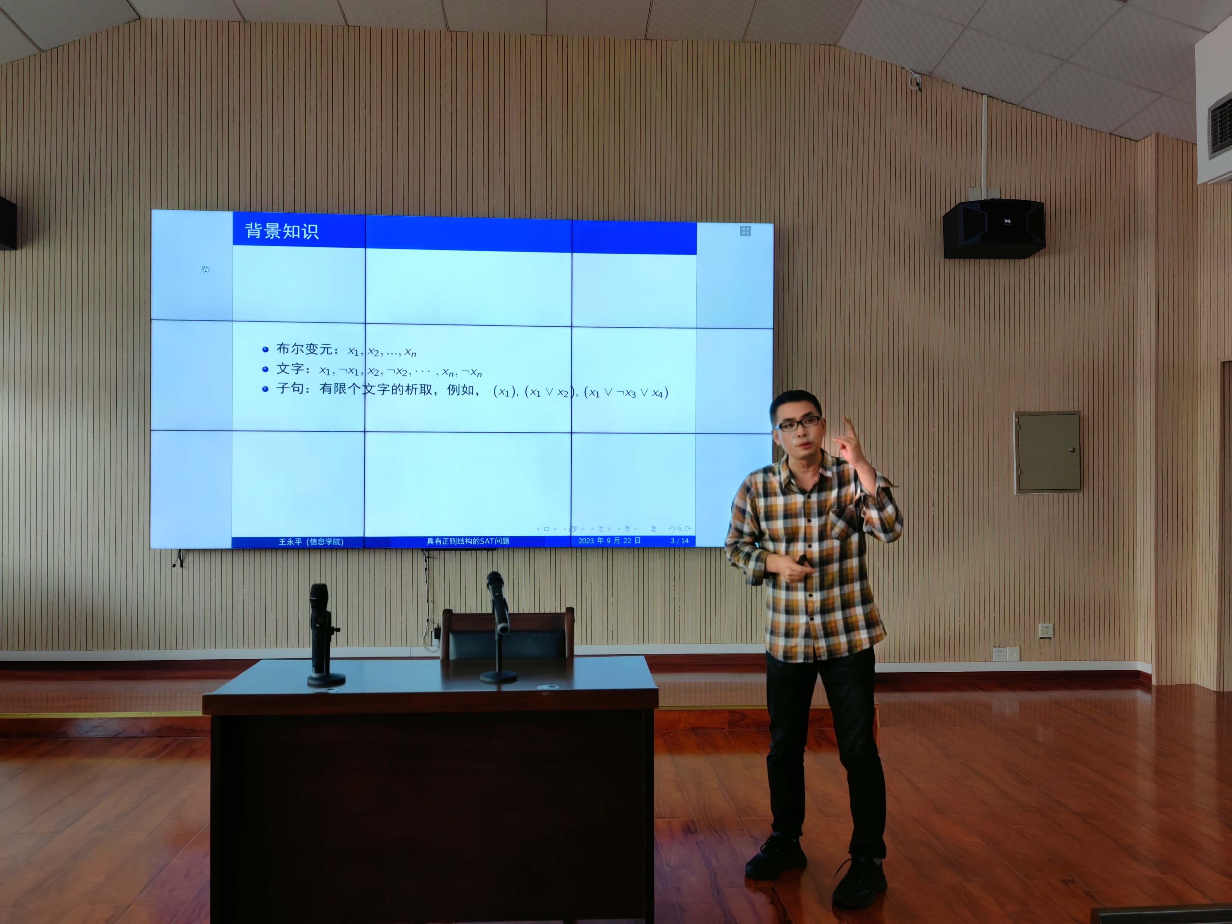 王永平博士的报告题目为“具有正则结构的CNF公式的可满足性问题”。SAT问题的求解在最坏情况下一般需要指数时间,然而SAT问题在人工智能、集成电路设计、软件检测等领域有广泛应用,因此研究SAT问题具有理论意义和实践意义。王永平博士提出了严格d-正则(3,s)-SAT问题,并持续开展了研究,取得了系列成果。