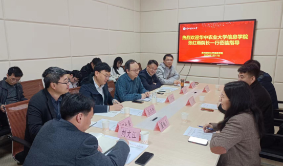张红雨院长一行赴我院开展合作交流。我院院长邓明森,副院长刘文江、崔鹏,管理科学与工程学院院长郭长睿,产业数字化研究院院长陈建平,贵州航天智慧农业有限公司孟庆伟等参加了交流会。